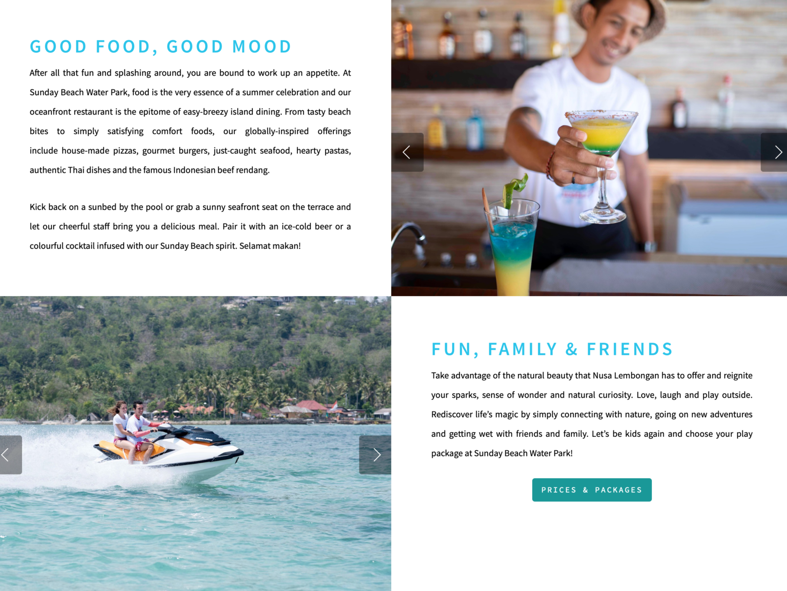 Welcome to Sunday Beach Water Park on Nusa Lembongan, a small island southeast of Bali. This breezy Balinese Beach Club is the epicentre of absolute, unadulterated soaking wet fun with your friends and family. Whiz down the waterslides, soak up the chill-beach vibes or check out the exciting line-up of water activities. This whole place is about having the time of your life. So let’s play and get ridiculously wet and wonderful!